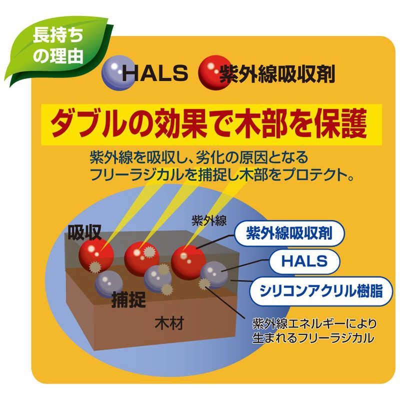 ●シリコンアクリル樹脂にHALS(紫外線劣化防止剤)とUV吸収剤を配合し、木部の長期間色あせ防止と耐久性を向上させました。