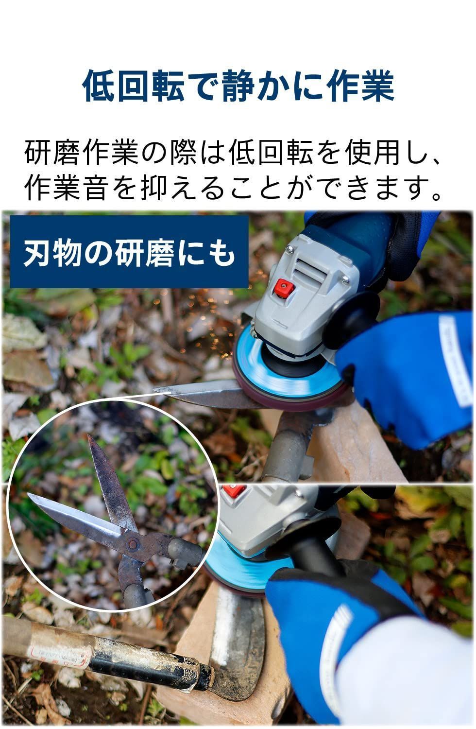 【使い方のヒント】低回転数で使用する場合、高回転での使用時に比べモーター冷却のために周囲から取り込む空気量が少なくなります。そのため、低回転で長時間連続して作業された場合はモーターの 温度上昇が早くなり本体が熱くなることがございます。使用中に本体が熱くなった場合は一旦作業を止めていただき、回転数を最高回転に設定の上、数分間空回してモーターを冷却するようにして下さい。温度が下がったら作業を再開していただいて問題ありません。