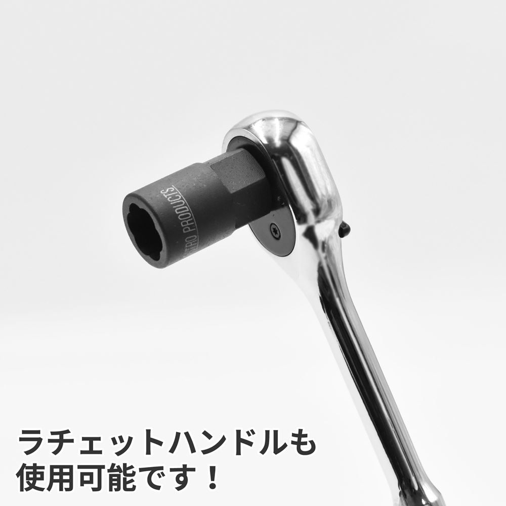 差込部側がヘックス形状なので、スピンナーやラチェットハンドルだけでなく、メガネレンチなどで回すことも可能です。