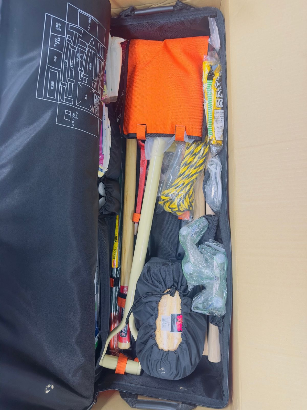 平バール(900mm)、ボルトカッター(600mm)、折込みのこぎり(刃渡り210mm)、大ハンマー(両口3.5kg)、丸カケヤ(直径150mm)、バチヅル(1.8kg)、ショベル(丸型935mm)、誘導用ロープ(10m)、牛革手袋(×2)、ゴーグル(×2)、防塵マスク(×2)、ホイッスル(×2)、三角巾(×1)、ガーゼ(×2)、包帯(×2)、ウェットタオル(20枚入)