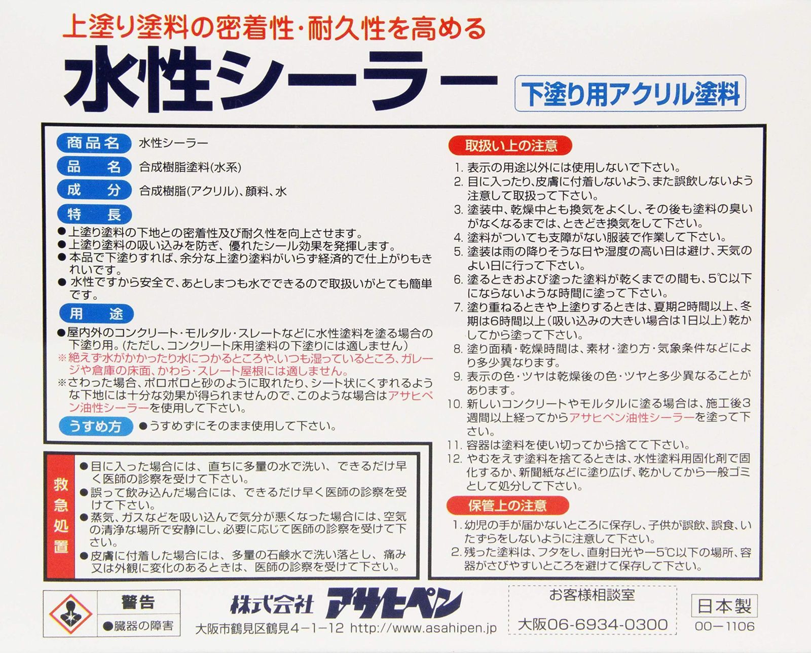 用途:(屋内外区分:屋内外用)屋内外のコンクリート・モルタル・スレートなどに水性塗料を塗る場合の下塗り用。