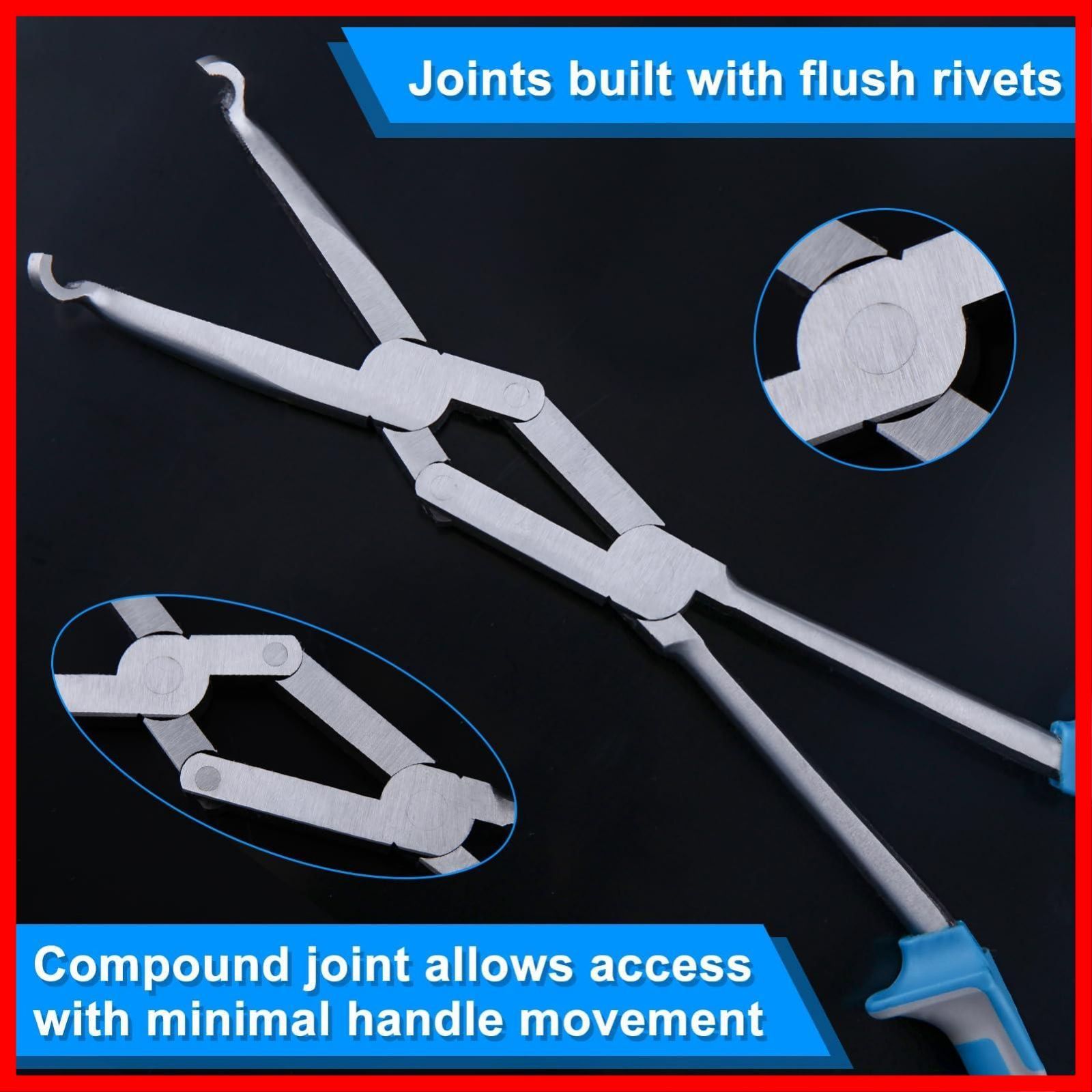 【デザイン】プライヤーはダブル・ジョイント式で、開閉をコントロールしやすく、手の力を軽減できます。先端が長く、深い箇所のホースの取り外しに便利です。くわえ部は、掴んだ物が滑りにくいギザ付き、作業は楽です。