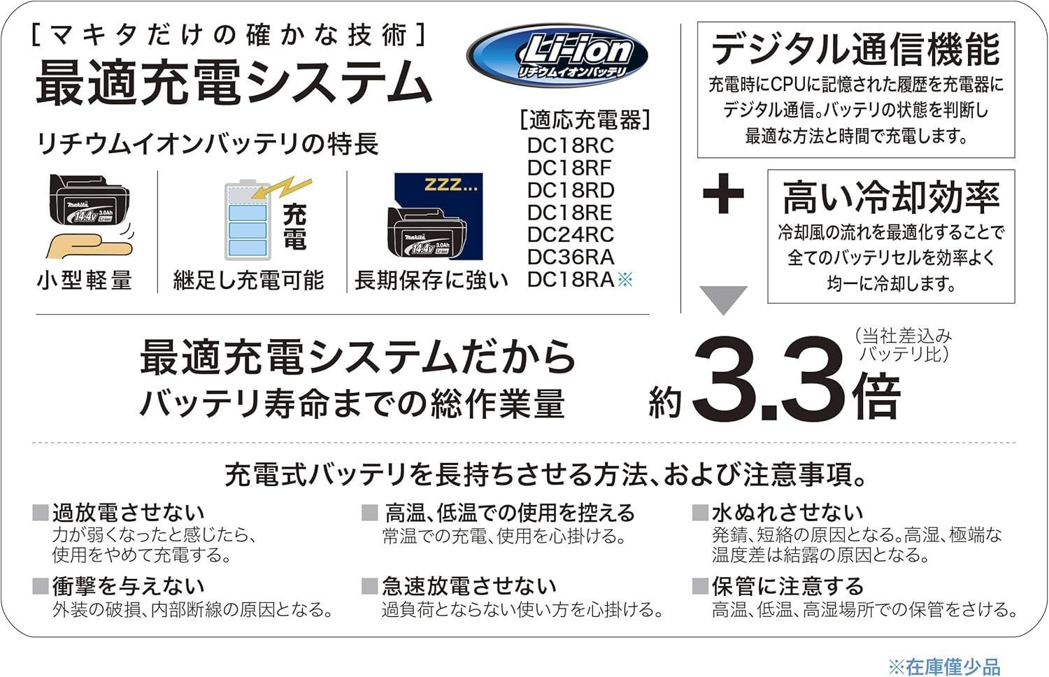 適合充電器:DC18RC / JPADC18RC ●「新・最適充電制御」対応。DC18RF使用時フル充電約40分※1、実用充電・約27分※1、※2