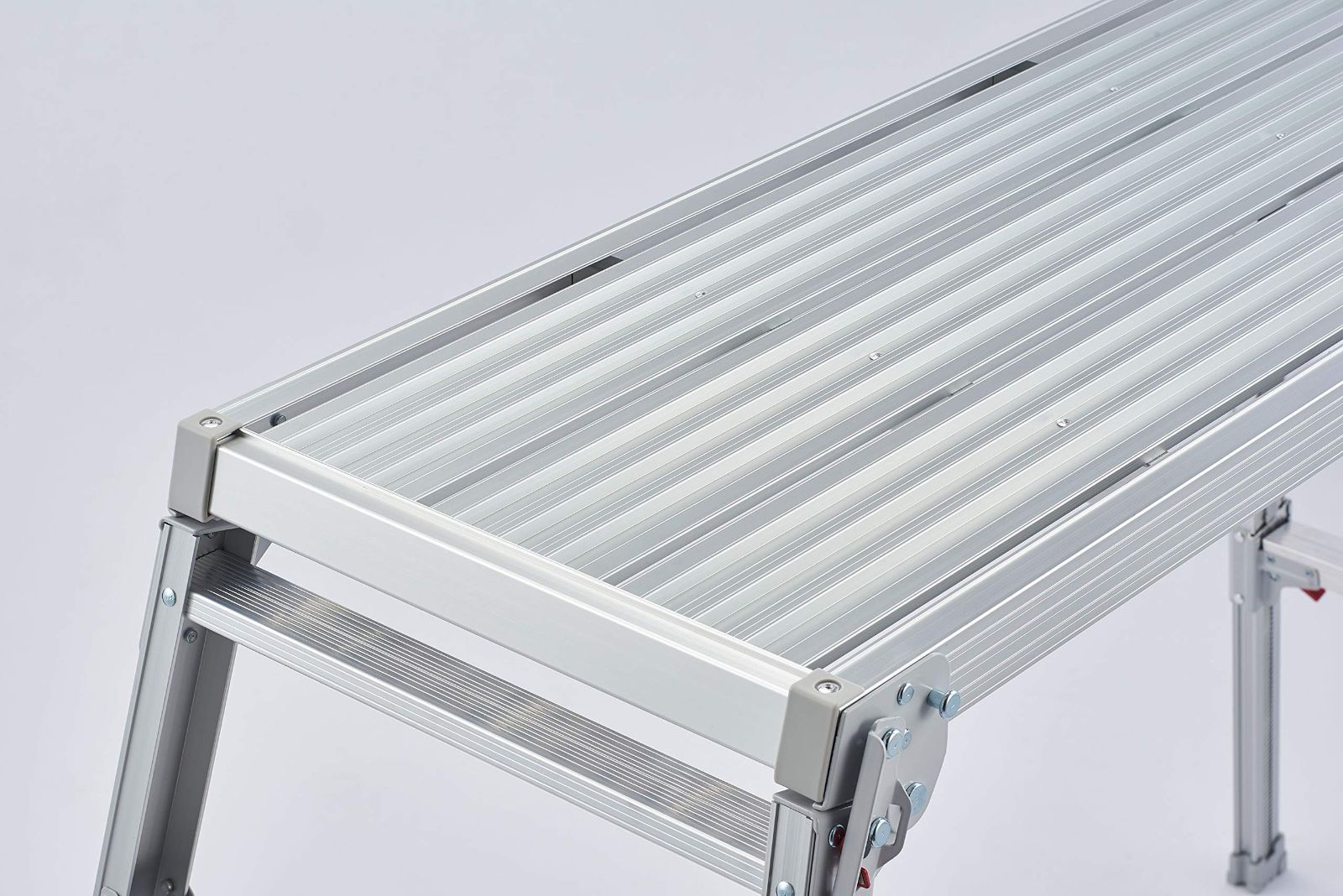 足場スペースよりワイドで安心な脚部伸縮式足場台。段差で威力を発揮するロングストロークの伸縮脚。ワンタッチで操作でき、簡単です。足元にゆとりのある幅広設計。