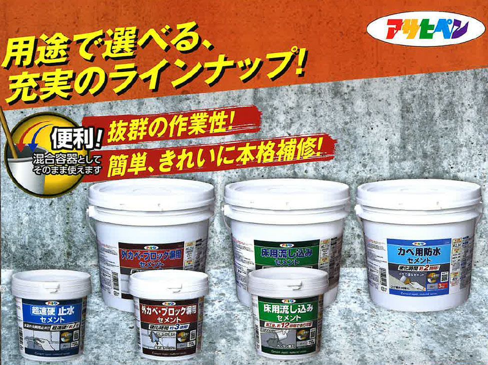 コンクリートのカベ面を簡易に防水できる樹脂モルタル補修材です。
