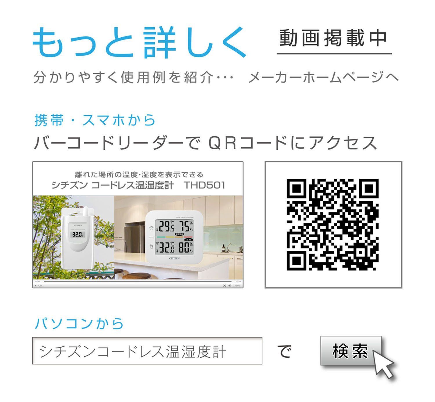 子機センサーから親機へ温湿度を自動通信親機と子機の2か所の温湿度を測定可能面倒な設定は不要。電池を入れるだけで測定。簡易熱中症指標を4段階で表示大きな液晶画面にみやすい表示サイズ:約幅148×高さ140×奥行25mm本体重量:約220g(電池含まず)表示:デジタル表示方式測定範囲:温度/-30.0~60.0℃、湿度/20~90%子機センサー設置距離:約30m(遮蔽物のない、見通しのよい空間距離)付属品:子機センサー1台、お試し用単3形アルカリ乾電池6本、取扱説明書(保証書付)電源:DC4.5V(単3形アルカリ乾電池×3本)