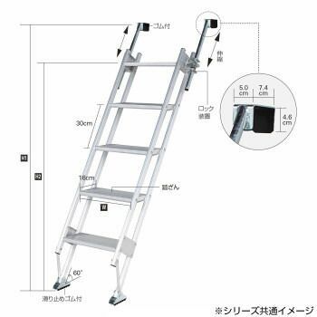 階段の奥行きが広く安心して昇降できます。フック部が伸縮するので、トラックの高さに合わせてセットできます。さらにロック装置付きで階段の位置が安定し、安全です。フックの有効内寸法が7.4cmあり、アオリだけでなく、足場パイプ等にも掛けられます。