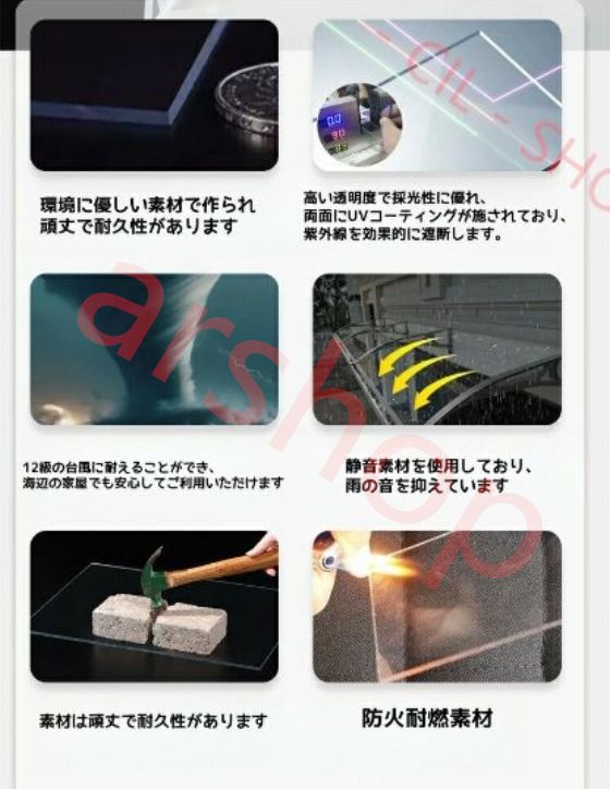 ひさしの素材住宅用ひさしは、透明度が高くて頑丈なポリカーボネート素材と、耐久性に優れたアルミ合金のブラケットを使用しています。ポリカーボネートは日光を完全に遮らず、室内が過度に暗くなることもありません。また、アルミ合金は耐久性に富んでいるため、長期間の使用に適しています。