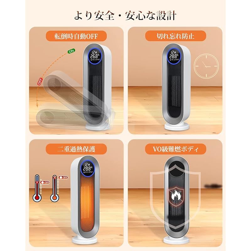 【もっと快適に、安心の暮らしを支える多重安全設計搭載】思わず蹴っ飛ばしたっり、不意の衝撃や地震などで転倒したりしまった時に自動で電源がオフになる「転倒オフ機能」。また、ひーたー内部の温度が上がり過ぎた時に自動で運転停止する「二重過熱防止機能」の安全機能は備えており、使用方法の不注意によるケガや事故が絶対に防げるわけではありません。ファンヒーター 電気の外装素材は「V0級難燃性安全素材」を使用され、高温でも燃えにくく安全性さらに固める。日本国内電気用品安全法(PSE)認証済です。安全・安心・安定・快適・満足な暮らしを提供します。