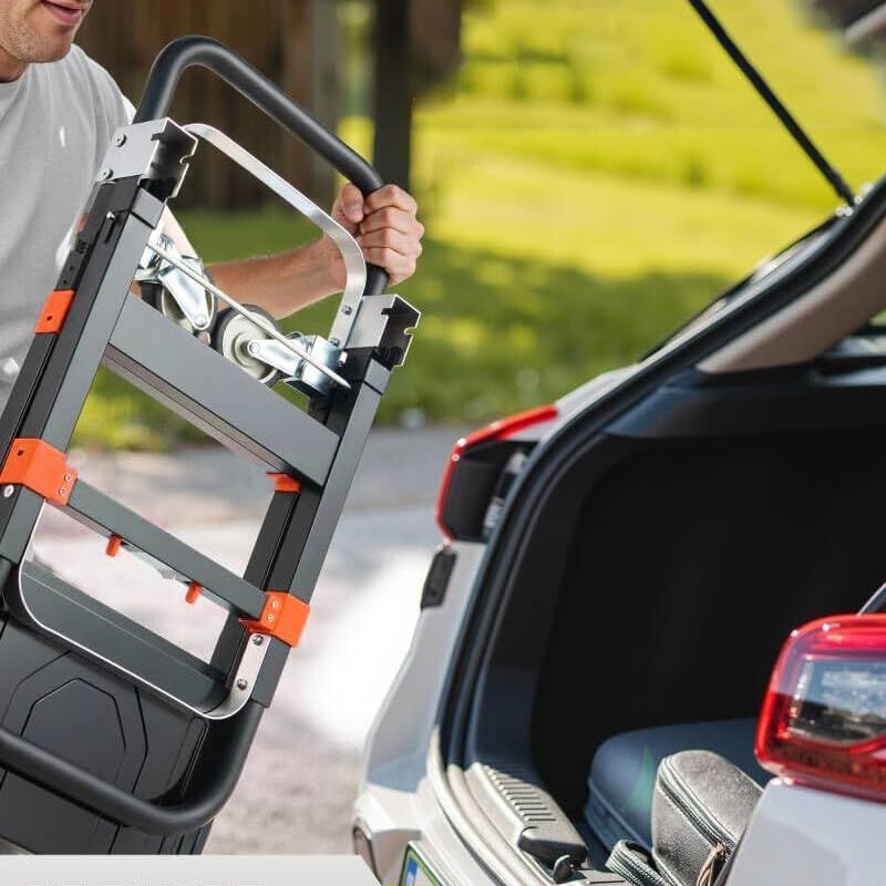 【使いやすく持ち運びやすい】折りたたみ式ハンドトラックドリーは完全組立式の折りたたみ式ハンドトラックカートです、組立不要、簡単な説明書付き、使用するために数分で簡単に展開します。車のトランク、ベッドの下、クローゼット、物置、ガレージなどに簡単に持ち運び、保管できるよう、平らに折りたたむことができます。場所を取らず、突然重い仕事が舞い込んできたときに最適です。