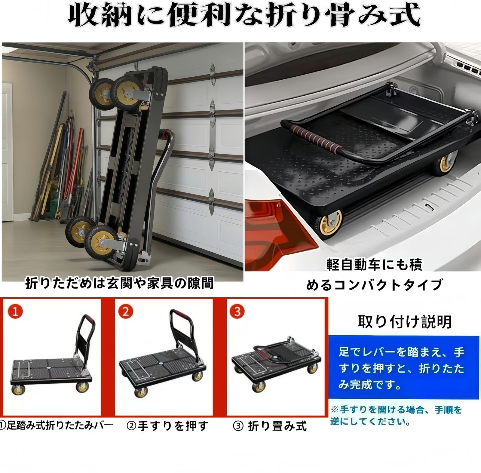 ??【折りたたみ式台車】軽量設計で簡単に組み立てられ、すぐにお使いいただけます。使わない時、足でレバーを踏まえば簡単にグリップを折りたたみできます。折り畳めてコンパクトに収納でき、持ち運びも簡単です。
