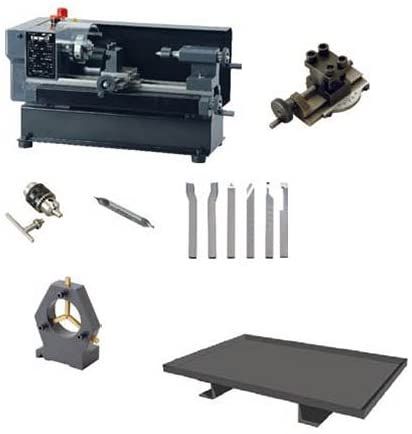 精密ミニ旋盤Compact3アドバンスセットにはスターターセットに付属されていたドリルチャック、センタードリル、6本バイトセットに加え、トップスライド、固定振止、チップスタンドが付属しています。