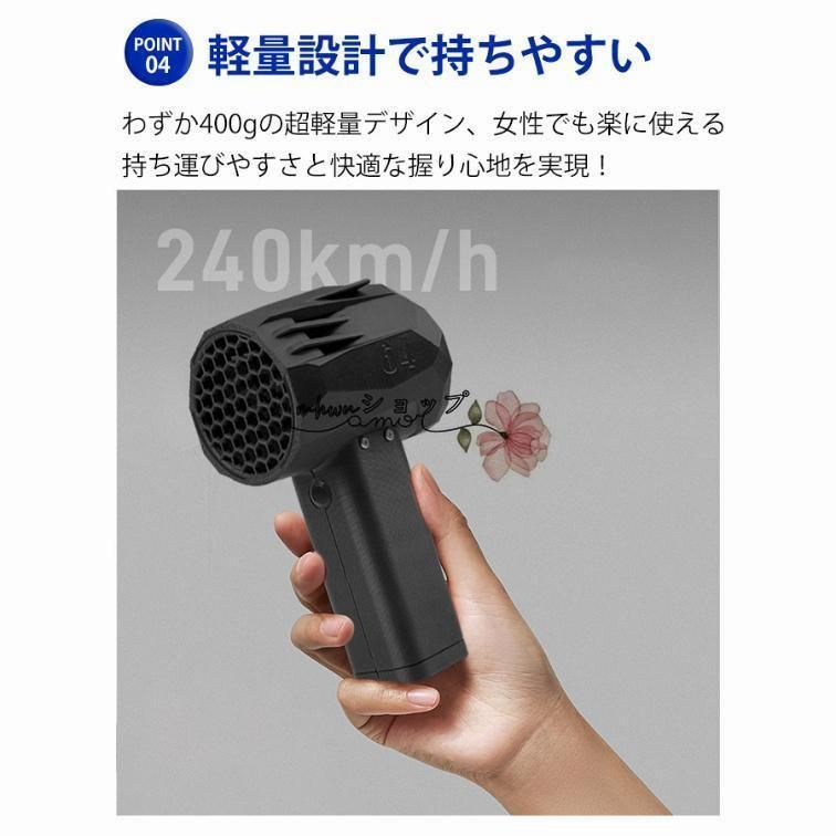 洗車や除雪など様々なシーンで活躍します、最大風速240km/hを誇り、効率的に作業をサポート。軽量設計で持ちやすい、大容量バッテリーを搭載し、長時間の使用も可能。小型ながらも強力な風力を発揮し、車の掃除や家庭内のホコリ取りにも最適です。