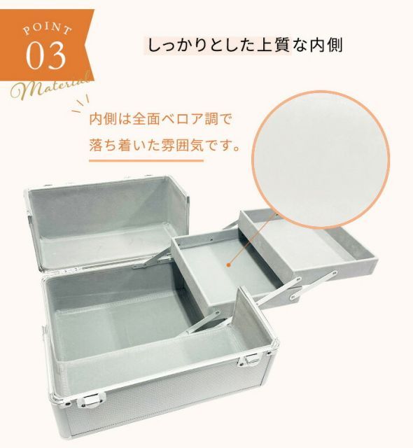 内部には横へ広がる2枚のトレイがついておりかさばる化粧道具をばっちり収納。
