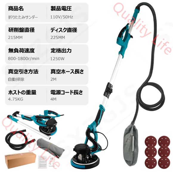 電気ドライウォールサンダー 1250 W 折りたたみ式 電動サンダー ディスクサンダー 可変速度800-1800 RPM 自動掃除機 研磨機 LED ライト付き 伸縮 ポールサンダー 天井と壁用 収納バッグ サンディングディスクク 110 V