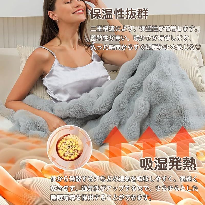 【冬の必須な毛布】うさぎの毛皮のように柔らかくふわふわブランケット、ふわっと軽くやわらかい肌触り、柔らい感触を体に感じます。触り心地も最高なふわふわ生地、圧迫感もない、膝や体にかけてふわふわで気持ちいいです。吸湿発熱わたが、寝ている間の汗を吸ってくれるためムレにくく、保温性にも優れている、快適に安眠できます。