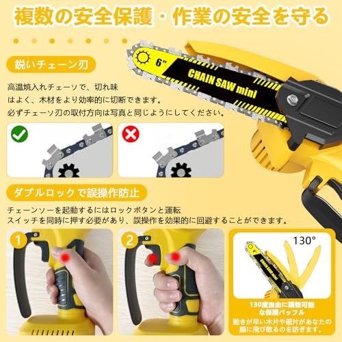 迅速に発送 充電式 電動チェーンソー 2000 mAh大容量バッテリー 搭載 21 V 電動のこぎり コードレス ミニチェーンソー 軽量 強力 木工切断 枝切り 薪作り 庭木の剪定 園芸設備 のガイドバーとチェーン 6インチ PSE認証済み イエロー