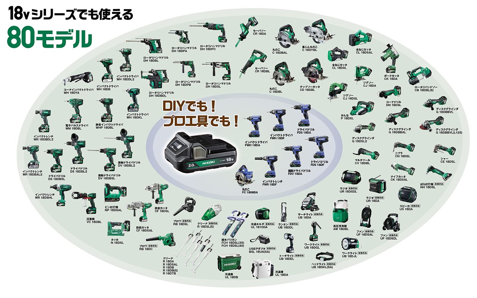 HiKOKI18Vリチウムイオン電池なら高容量タイプも使用可能! (1.5Ah~6.0Ahまで選べる電池! )