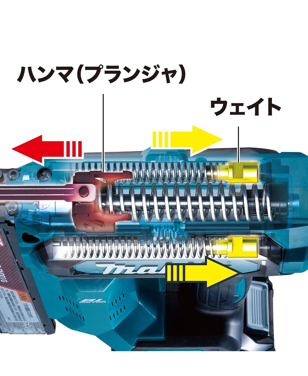 カウンターウェイト方式を採用。打込みに合わせてウェイトが後方へ動き、前後の振動を相殺。打込み時の反動やブレを低減。防じん・防水保護等級IP56。本機はもちろん、バッテリも対応。※粉じんや水による影響を受けにくいように 設計されていますが、故障しないことを保証するものではありません。