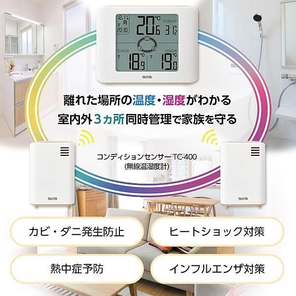 TC-400は、本体(親機)1台と子機2台のセットとなります。この3台を設置した場所の温度・湿度などが本体の画面に表示されます。
