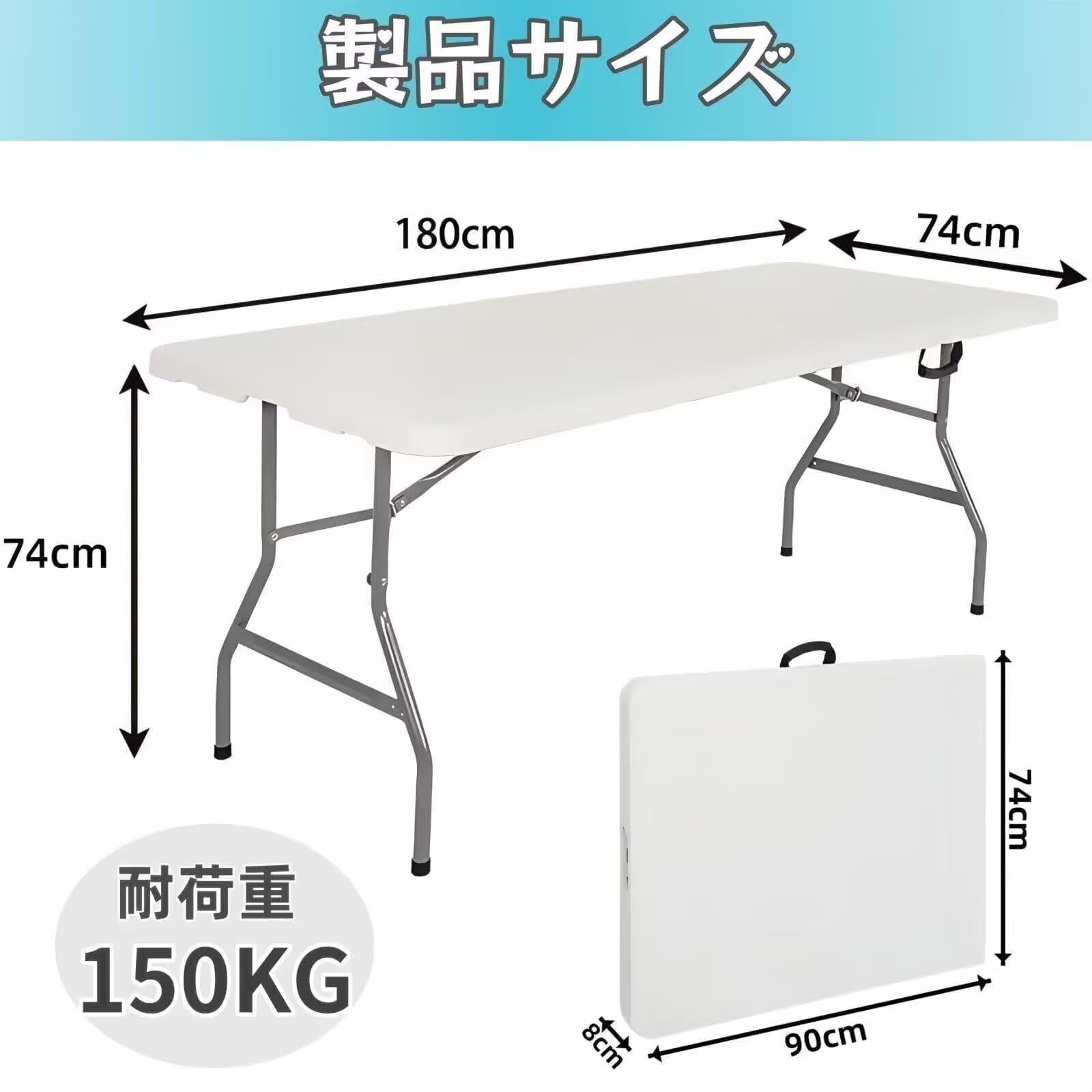 作業台 折り畳みテーブル ワークテーブル 幅180 cm×奥行74 cm×高さ74 cm アウトドアテーブル 折りたたみ作業台 軽量 レジャーテーブル 完成品 屋外 屋内 兼用 ホワイト 181.5 x 74