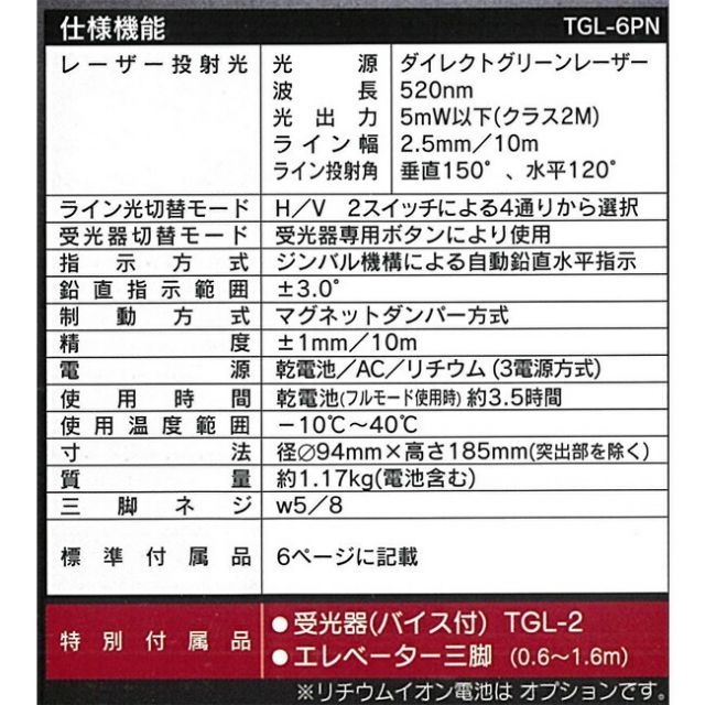 グリーンレーザー 墨出し器 TGL-6 PN 防塵 防滴 傾斜機能付き 蓄光塗料 見やすい 事故防止 寒冷地 対応 安定 手すり 階段 軽い 軽量 回転機構 ドット 3電源 3電源方式 受光器 バイス 三脚 エレベーター三脚 付き建築 現場 施工 工事 グリ