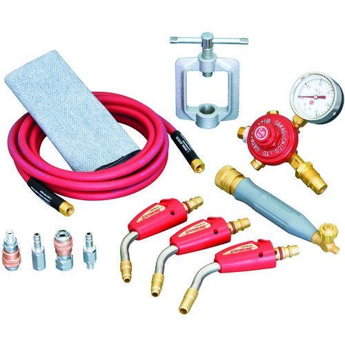 特長●ホースやチップの接続は、便利なワンタッチカプラ式です。●軽量コンパクトで楽に現場移動ができます。●銅管を包みこむ様に加熱するターボ炎で、スピーディーな作業ができます。●独自のエアー吸入方式により酸素ボンベがいらず、アセチレンボンベのみで使用できます。●ライター不要の電子着火タイプです。●逆火防止器付きです。用途●各種ろう付け作業に。仕様●軟ろう付:φ3インチまで●硬ろう付:φ21/8インチまで●ホース長さ(m):7.2●炎温度(℃):2350仕様2材質/仕上セット内容/付属品●チップ(φ6.4mm・φ7.9mm・φ9.5mm)、ハンドル本体、調整器(逆火防止器付)、カプラ一式、ガット、アセチレンホース、防炎シート、キャリングケース注意