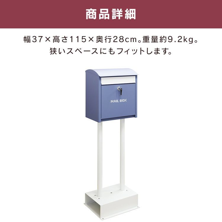 ・2色展開:カラーは上品な色合いのワインレッドとくすんだブルーのラベンダーブルーで、脚と台座部、郵便投函口はホワイトになります。