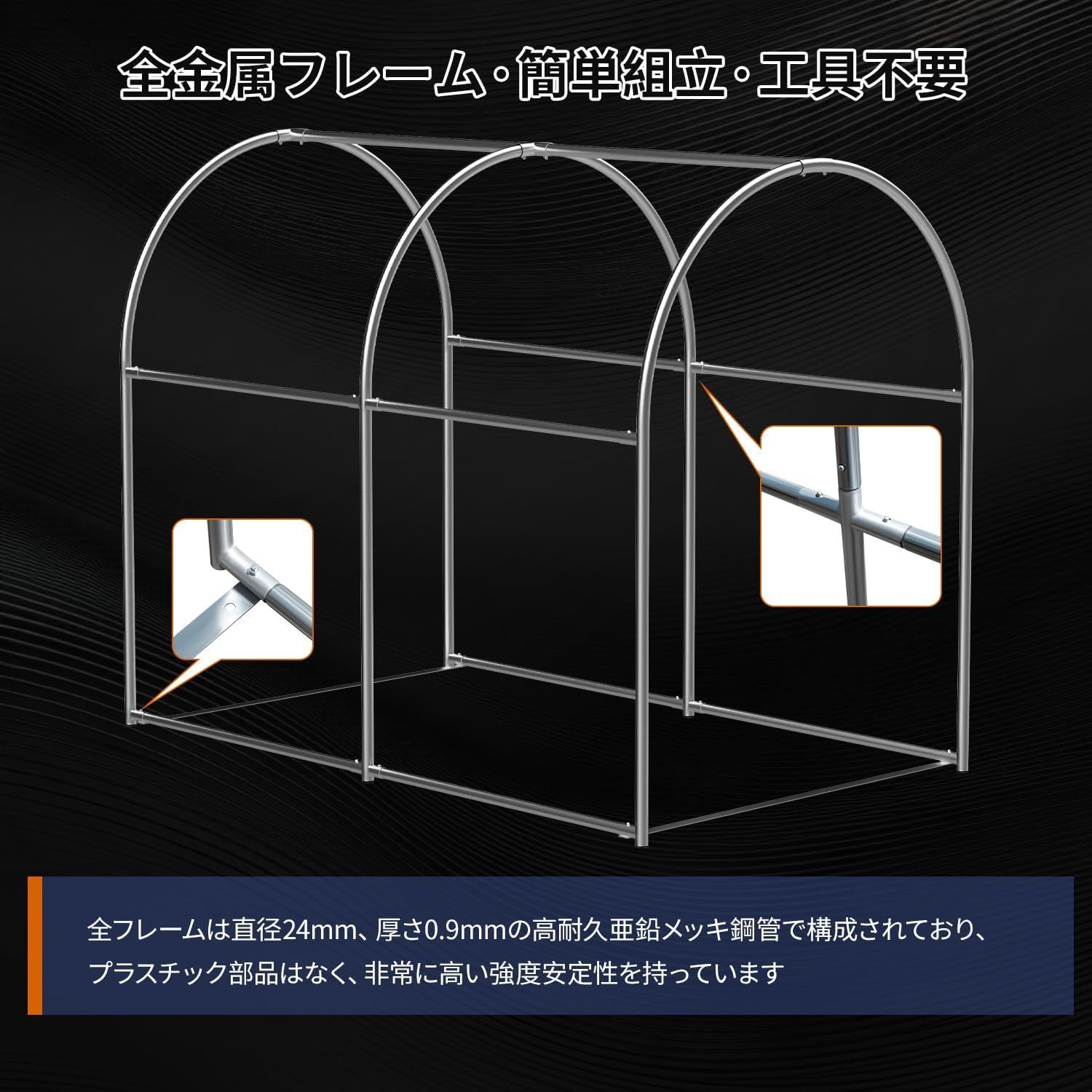 【2025最新登場・円型天蓋・出し入れ簡単】:2025年全面リニューアルモデル。円型天蓋デザインにより、従来モデルより高い安定性を実現。降雪・雨天への対応力が向上しました。両側大型窓を採用することで、優れた通風・放熱効果をもたらします。出入り口が広く、段差のないフラットアクセスフレーム構造で、愛車のスムーズな出し入れが可能です。底部に補強用のバーと、拡張ボルトの取り付け穴を追加して、コンクリート床面でも使用可能になりました。