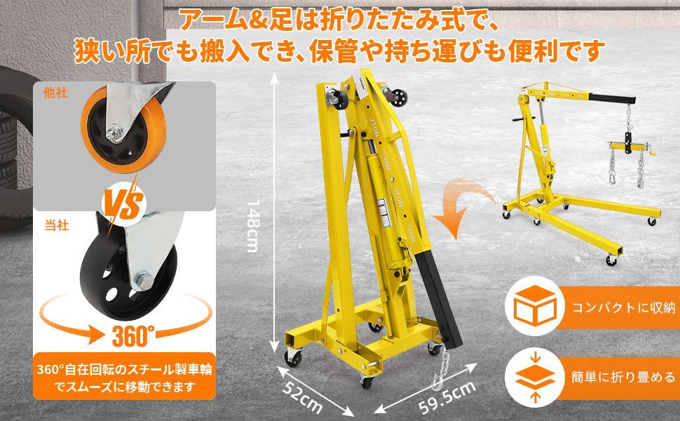 ガービー Garvee エンジンクレーン 2 t 4段階調節 油圧式 折りたたみ キャスター付き エンジンハンガー付き 2000 kg 作業工具 コンパク収納 吊り上げ 吊り下げ 家庭用 黄色