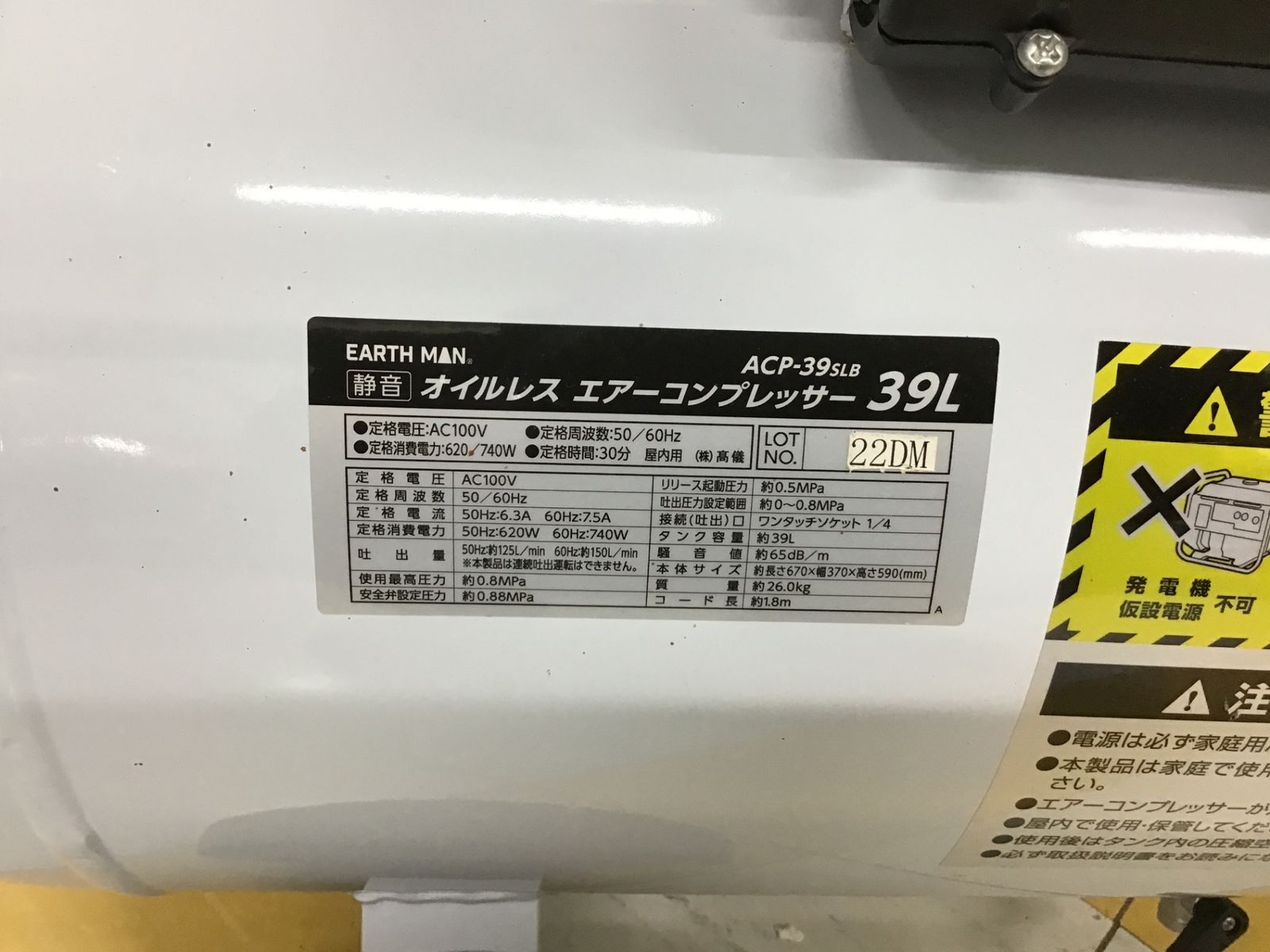 充填時間:50Hz 約5分・60Hz 約4.5分、接続(吐出)口:ワンタッチソケット1/4、タンク容量:約39L、騒音値:約65dB/m