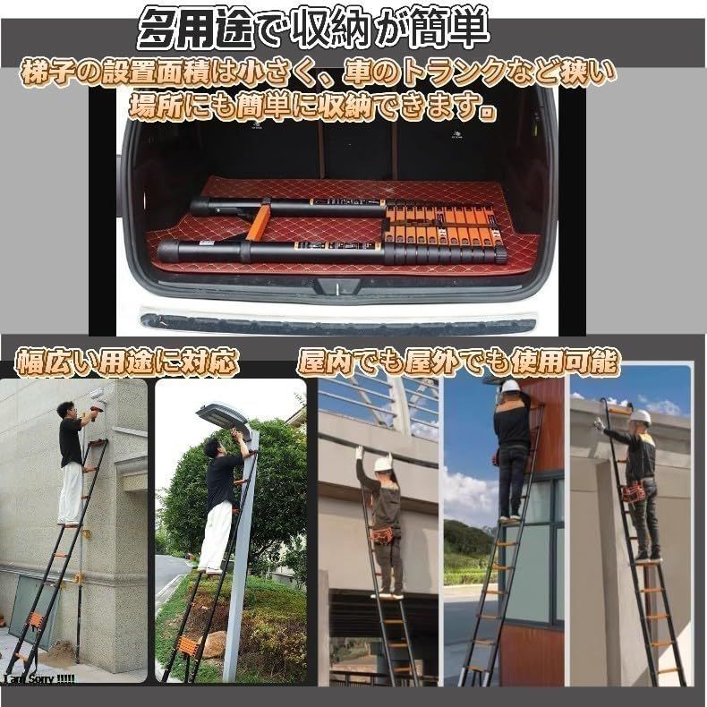【パッケージ内容】1 x 伸縮はしご、1 x 滑り止めゴム製緩衝パッド、1 x 日本語説明書 ツールバッグ、1 x ユーザーマニュアル、1 x 書。耐荷重150kgの高硬度炭素鋼はしご。 耐寒性、耐熱性、耐クラック性、耐落下性、耐滑性に優れた高品質Q235炭素鋼材を採用。 様々な使用環境と使用シーンに適し、高品質で耐久性があります。 頑丈で、同時に超高弾性率を持ち、重心がずれるのを防ぎます。 より安全にお使いいただけます。 使用中に何か問題が発生した場合は、お気軽にEnjoyBeautyLifeチームまでご連絡ください。