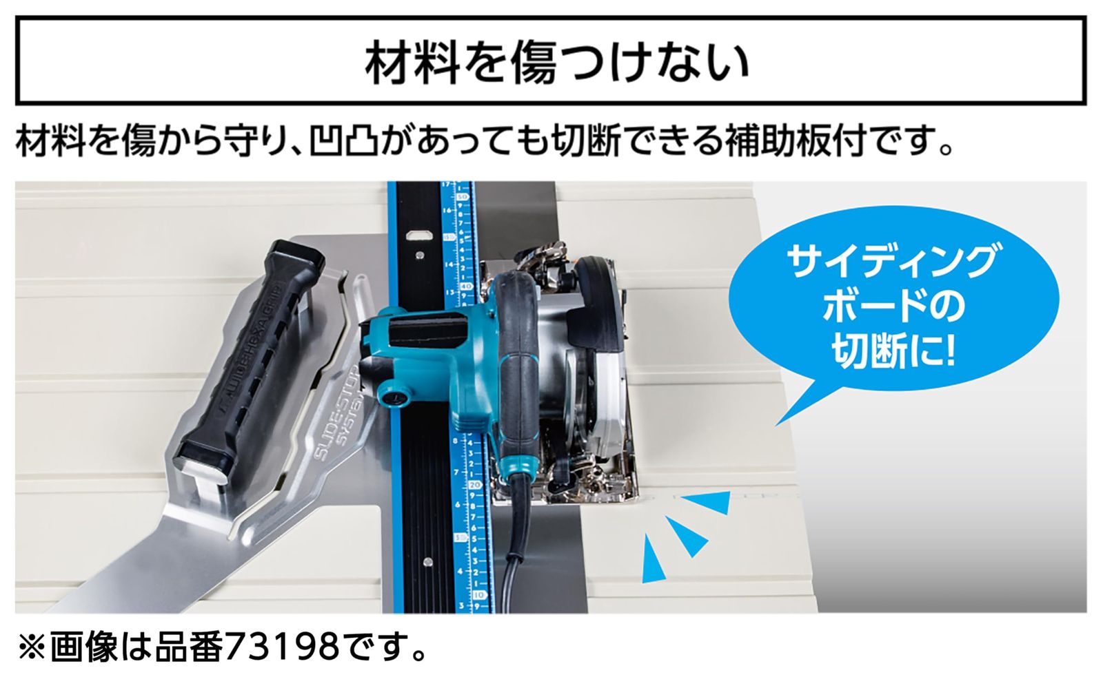 材料を傷から守り、凹凸があっても切断できる補助板付です。